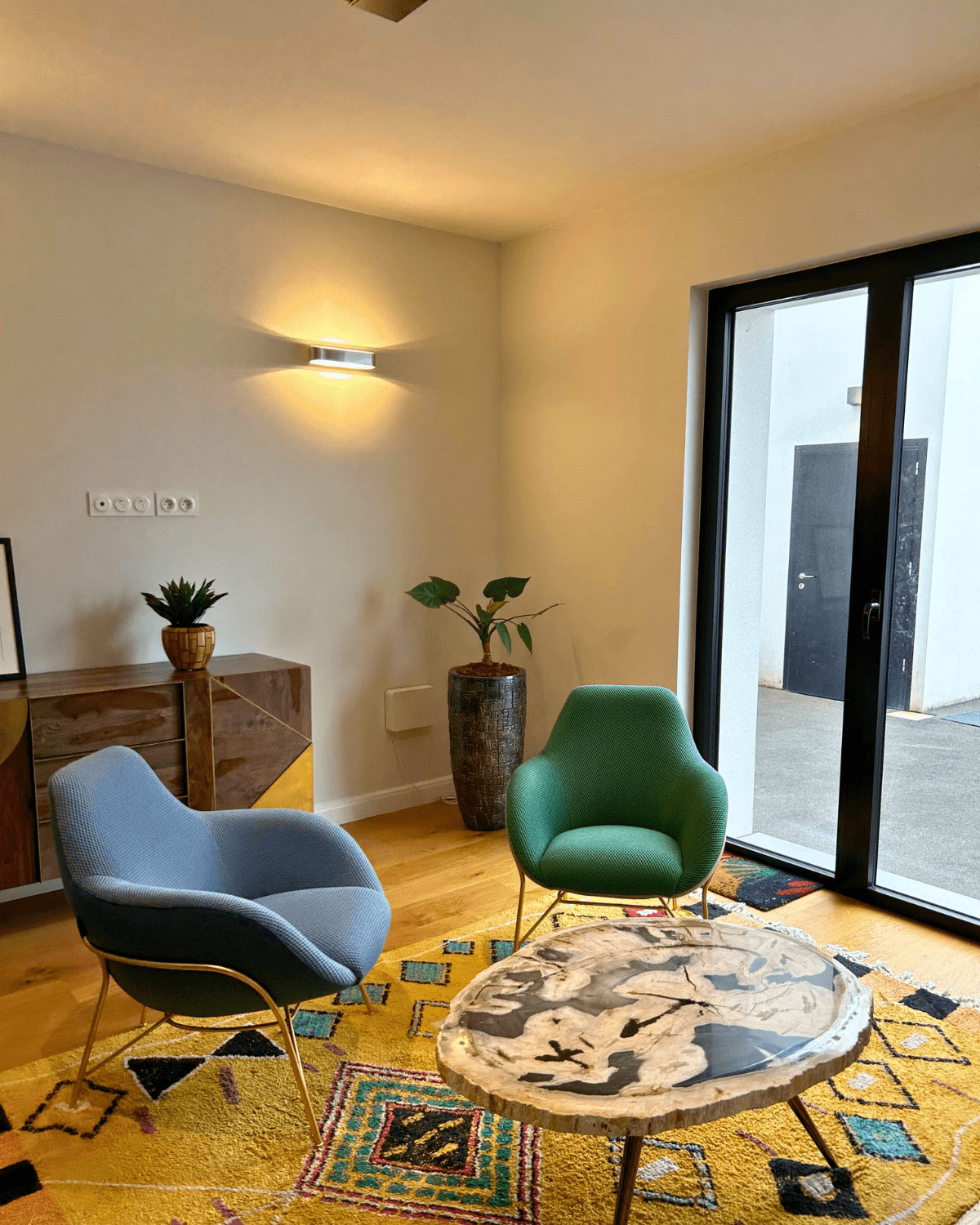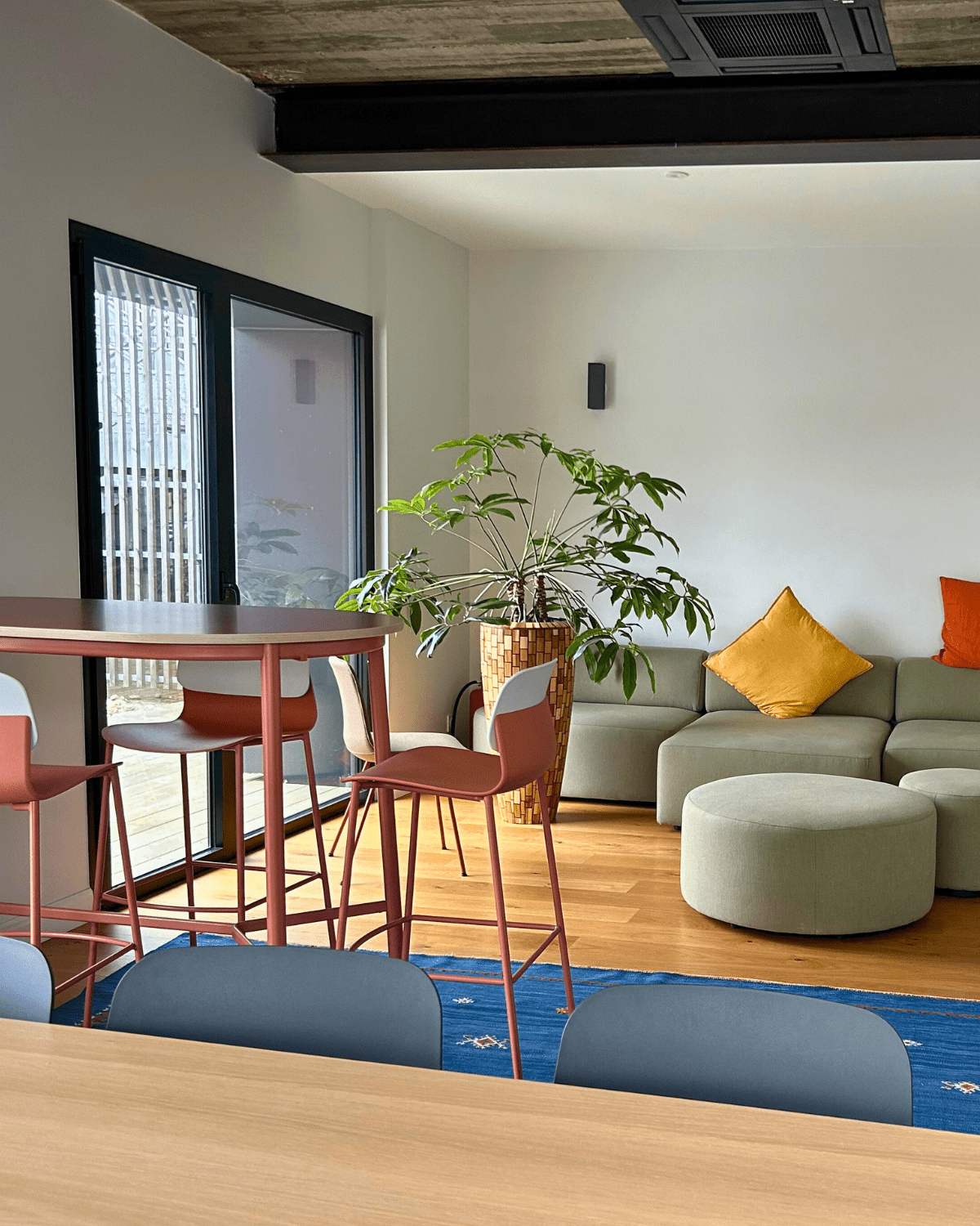 Acquis en février 2019, nous avons tout refait dedans, abattu des cloisons, agrandi les ouvertures… Nous avons pensé la conception et l’aménagement en équipe. Véritable lieu de vie, nous avons travaillé les espaces de façon à recevoir nos collaborateurs et nos clients dans un environnement chaleureux. En plus de vous y accueillir, le Showroom nous permet de vous présenter du mobilier, nos catalogues et nuanciers pour appréhender au mieux votre projet. Venez pousser la porte de nos bureaux, boire un café sur la terrasse ou vous réfugier de la pluie sur un de nos canapés, on vous trouvera toujours de la place ! Nous, nous nous y sentons comme à la maison.